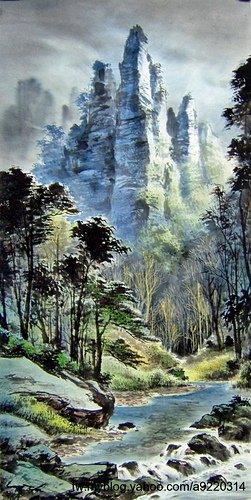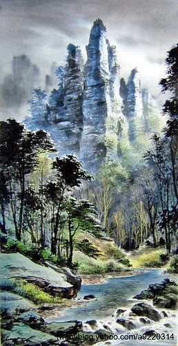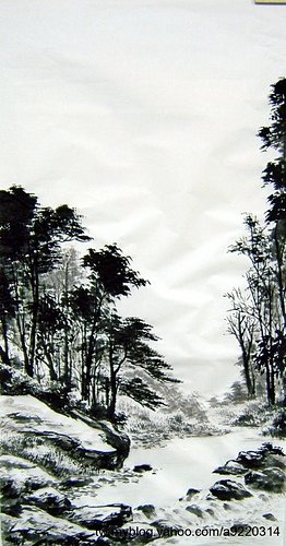 3用花青、籐黃、赭石染出樹林、山石、河水