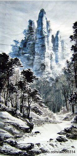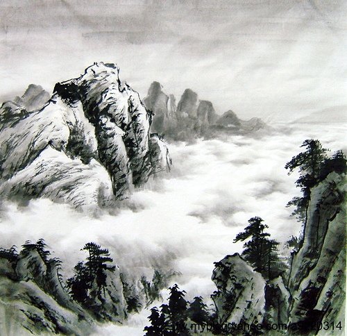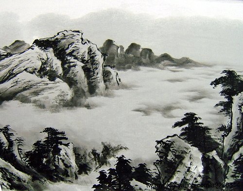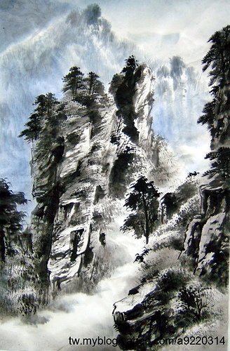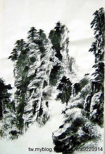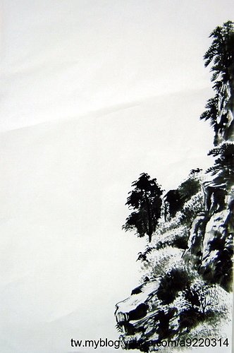1.用墨畫山巒和樹林,淡墨染雲霧