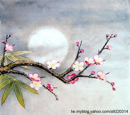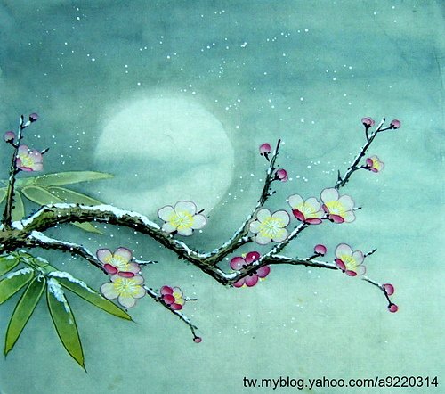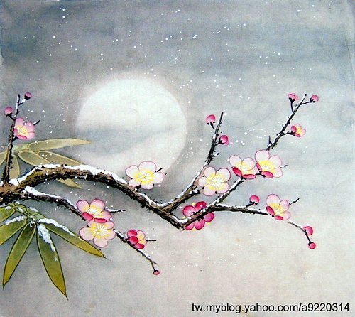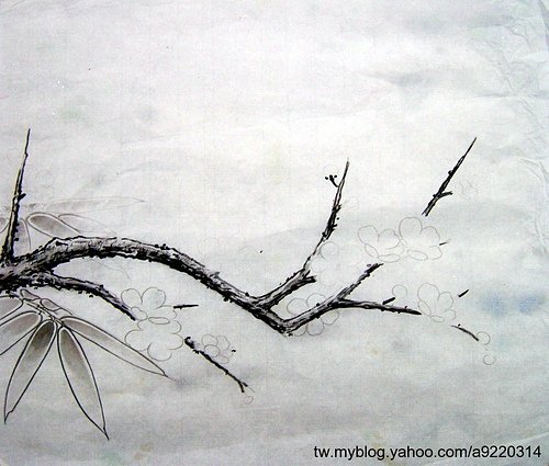 4.用白色先畫梅花樹幹的積雪,再灑上白色的雪花。