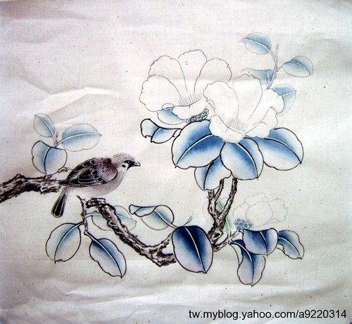 10.茶花點上花蕊,用花青畫上淡淡的背影,增加層次感。