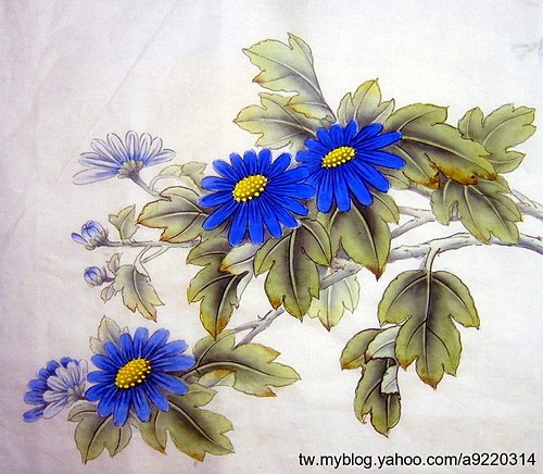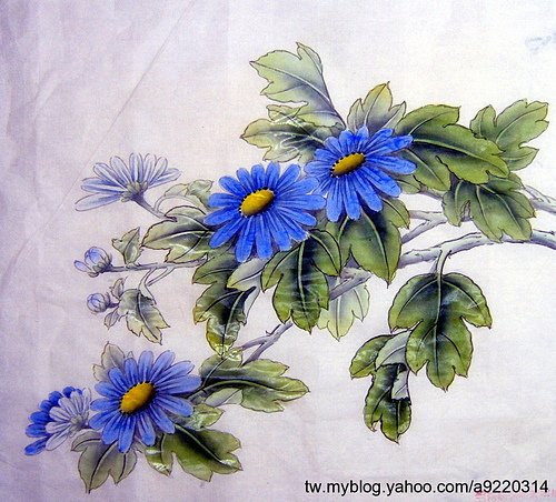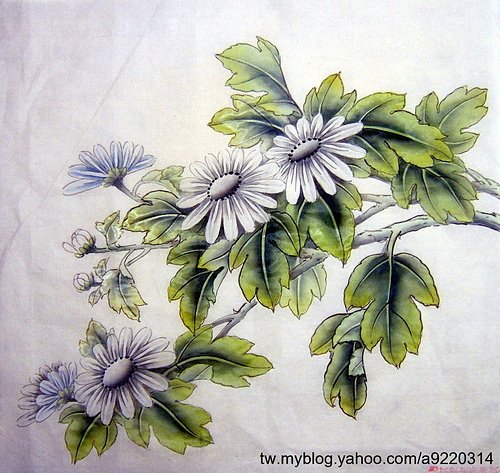 7菊花花瓣再次罩染,用藤黃調白粉點上花蕊