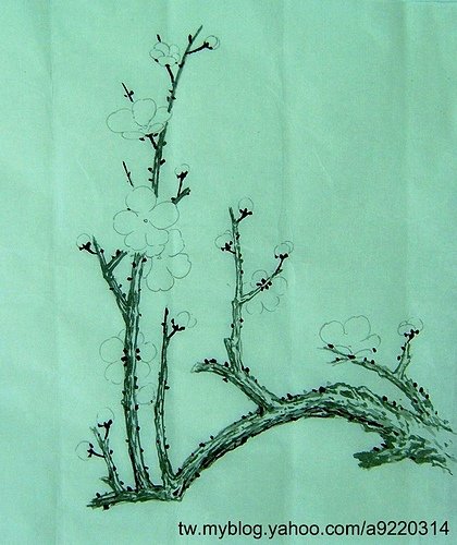 5.用白粉和藤黃點好花蕊後,再用石綠分染梅樹。
