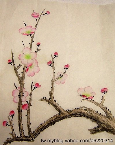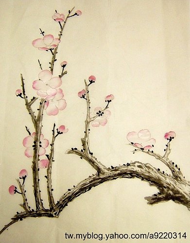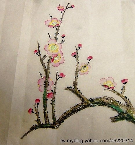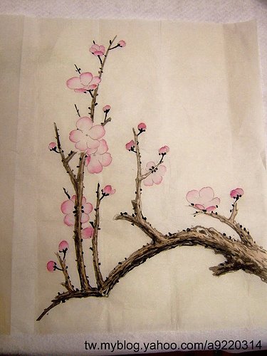 3.調淡淡的白粉罩染梅花、花瓣 ,梅樹、樹幹染上赭石。