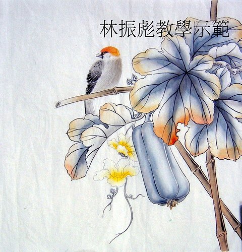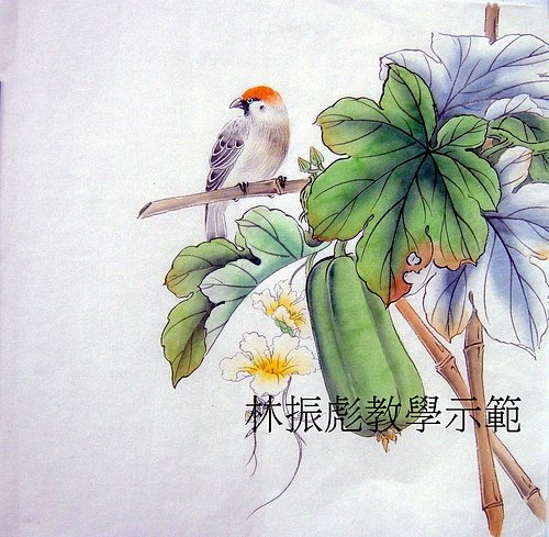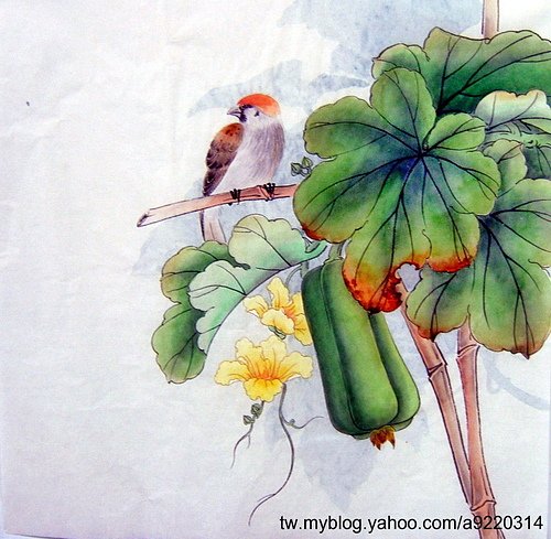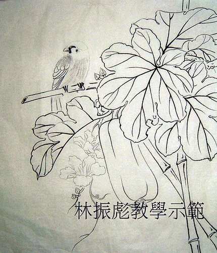 步驟 二: 白描完成後先用淡墨分染葉脈、絲瓜、雀鳥等按步驟反覆染出明暗濃淡,而 到個人滿意