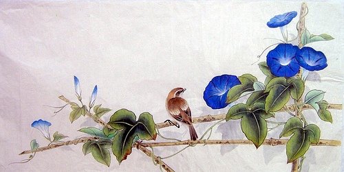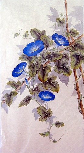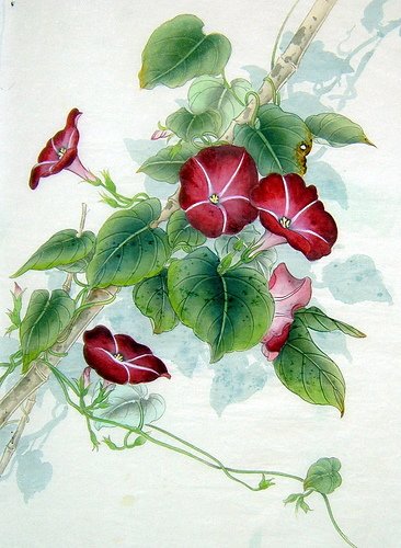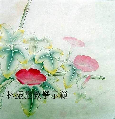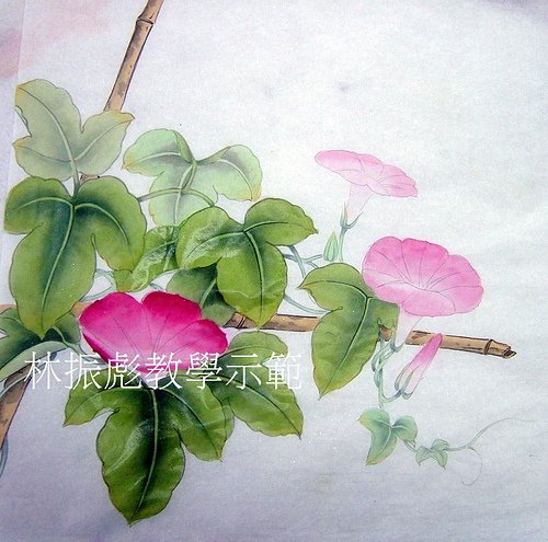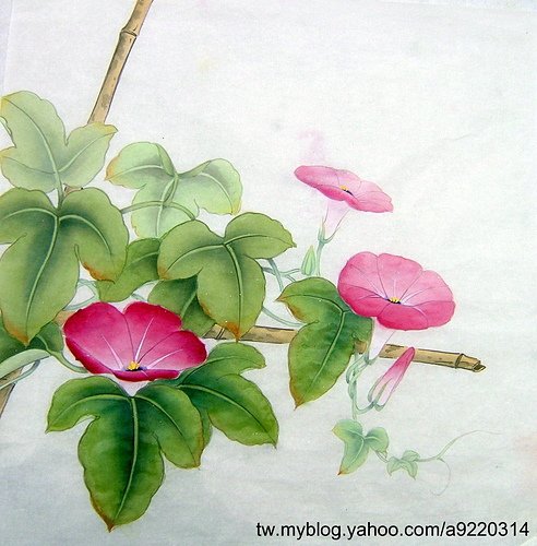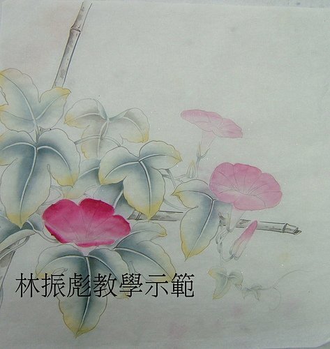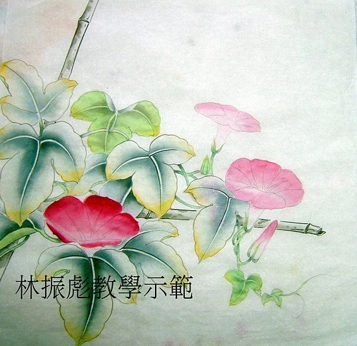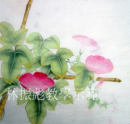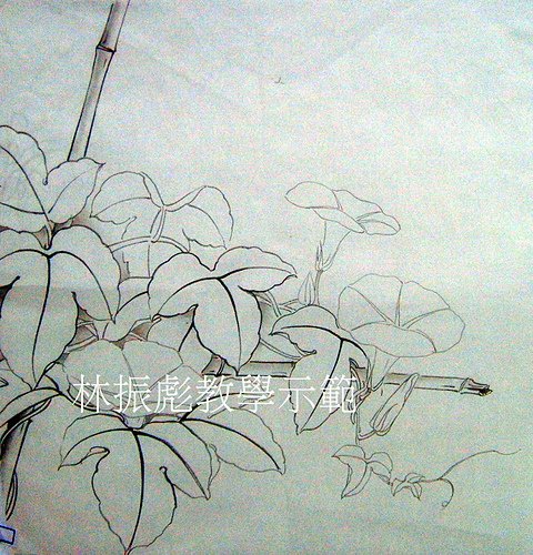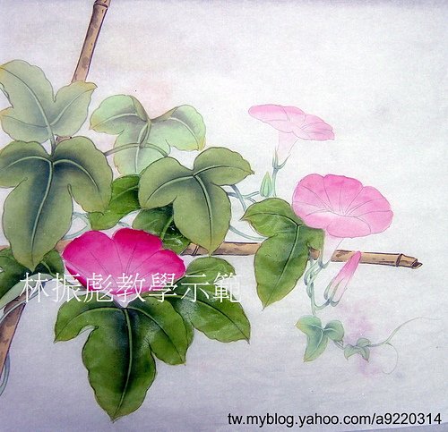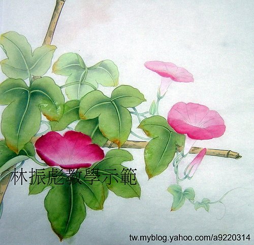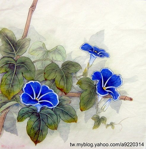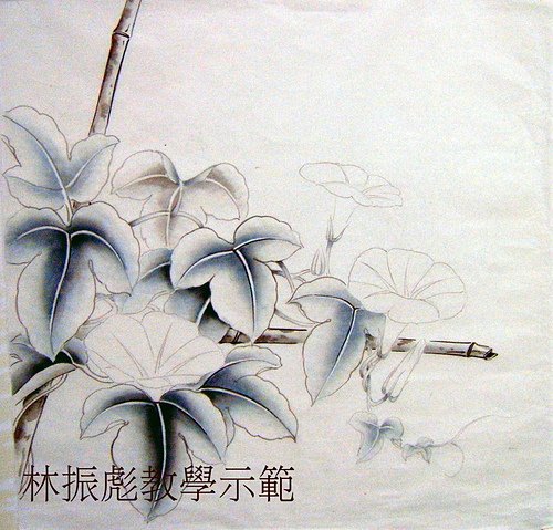 步驟二:續白描後先上墨色後上花青,牽牛花葉片部份先用淡墨分染明暗濃淡’注意整体的層次分明。