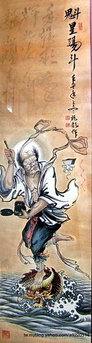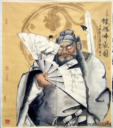 鍾馗「驅魔 之神」,神話中傳說鍾馗是終南進士,雖然才華出眾,高中狀元,卻因相貌醜陋而被皇帝免去狀元的資格,一怒之下,撞階而亡,死後受封為「驅魔大神」,閻王知命含冤、令負屈兩將軍助其斬除妖魔,並將奈河橋小鬼化為蝙蝠,任其嚮導。民間繪畫中則有鍾馗吃鬼、迎輻(福)、嫁妹(魅)、醉酒等內容,均源自唐代以來歲暮掛鍾馗像以驅鬼避邪之舊俗。